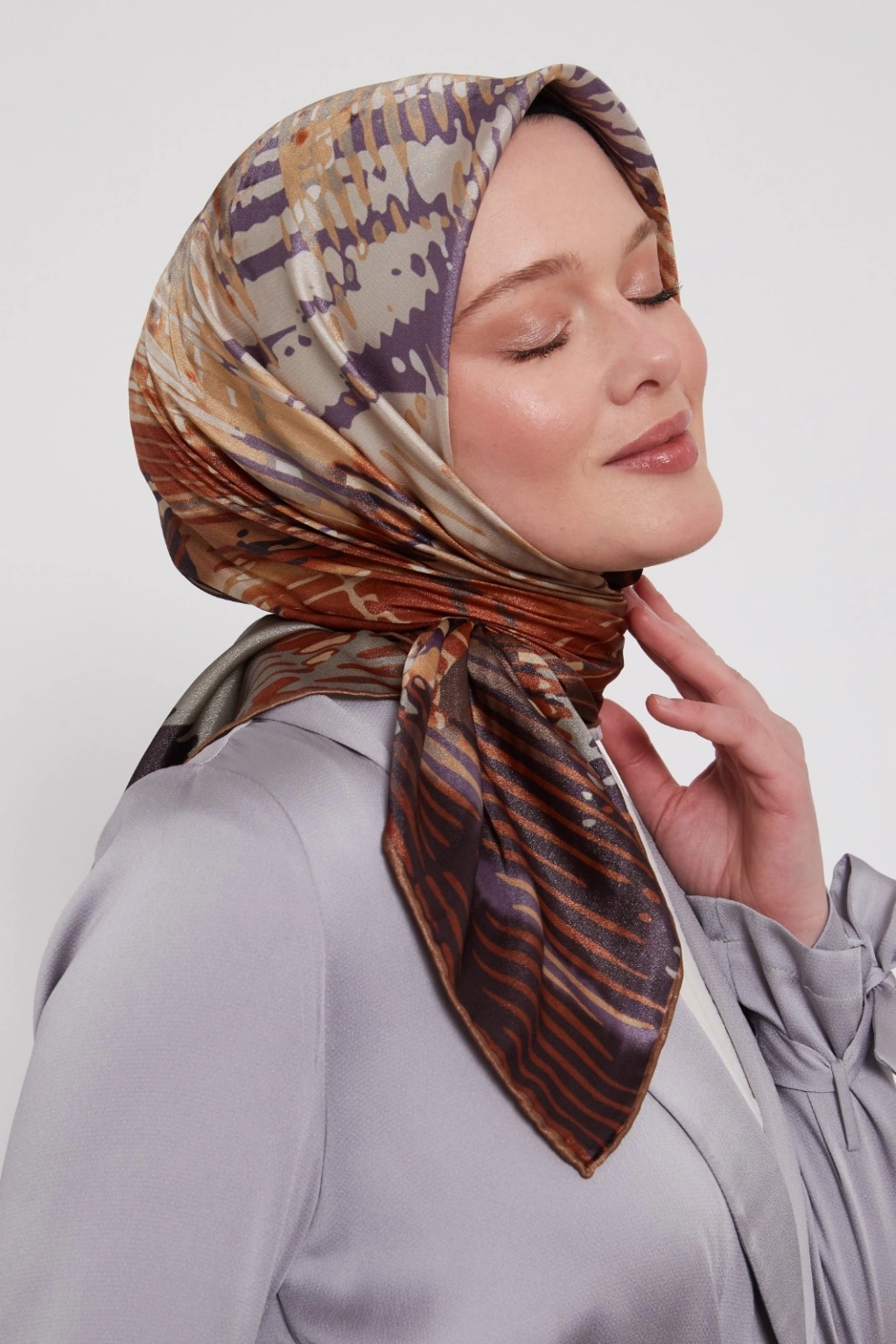Ebatları 90x90 cm olan bu eşarp, farklı bağlama teknikleri ile kullanım kolaylığı sağlar.