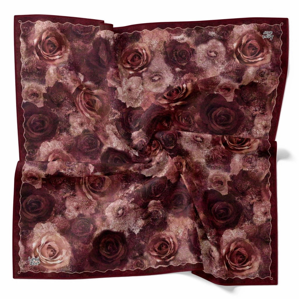 Ebatları 90 x 90 cm olan bu eşarp, etkileyici gül deseni ve canlı bordo rengi ile göz kamaştırıcı bir görünüm sunar.