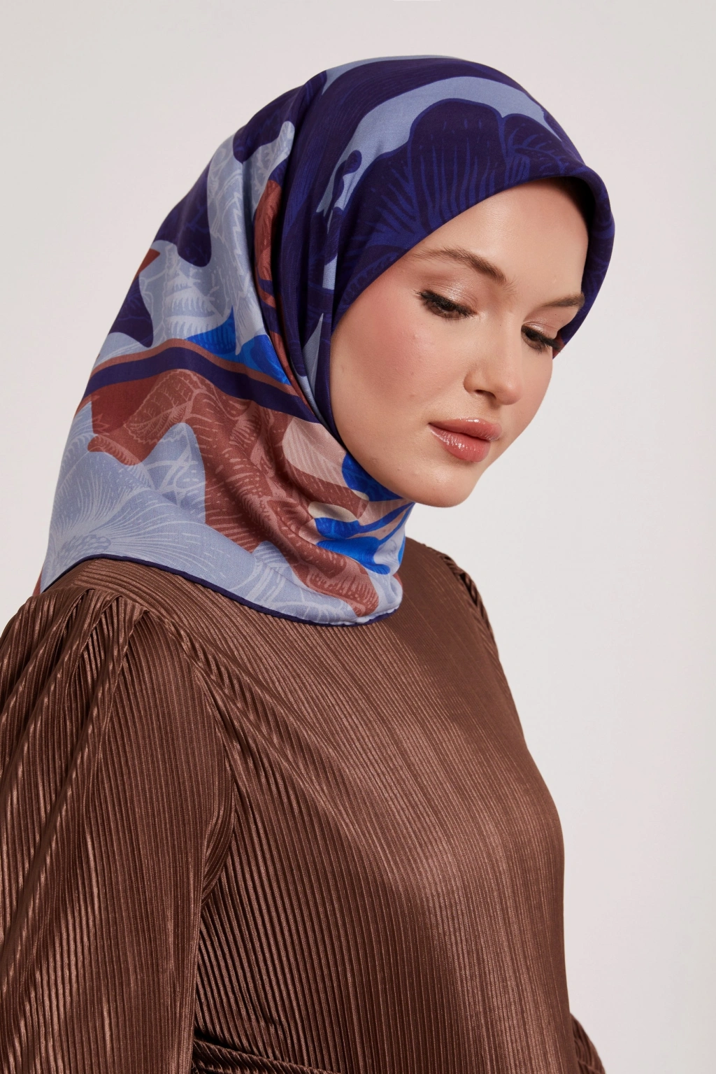 Ebatları 95x95 cm olan bu eşarp, farklı bağlama şekilleri ile kullanılabilir.