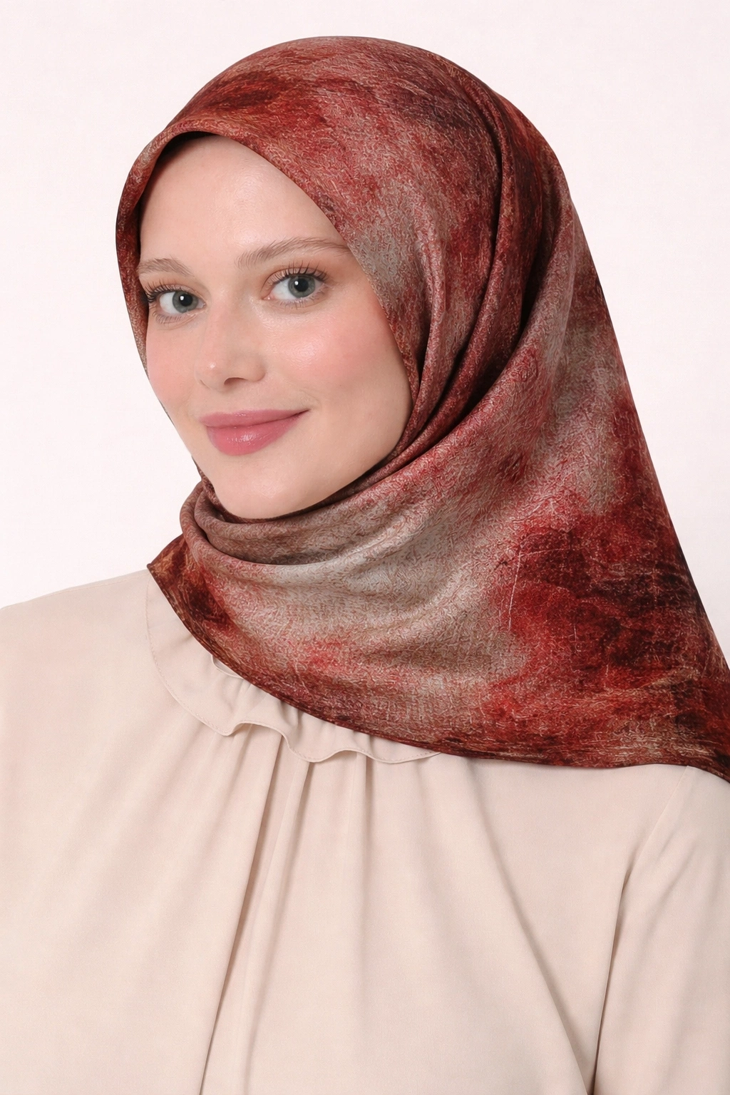 Modern ve şık tasarımı ile öne çıkan bu eşarp, bordo renkteki batik deseniyle her tarza uyum sağlar. 90 * 90 ebatlarındaki boyutu sayesinde farklı bağlama teknikleriyle kullanılabilir.