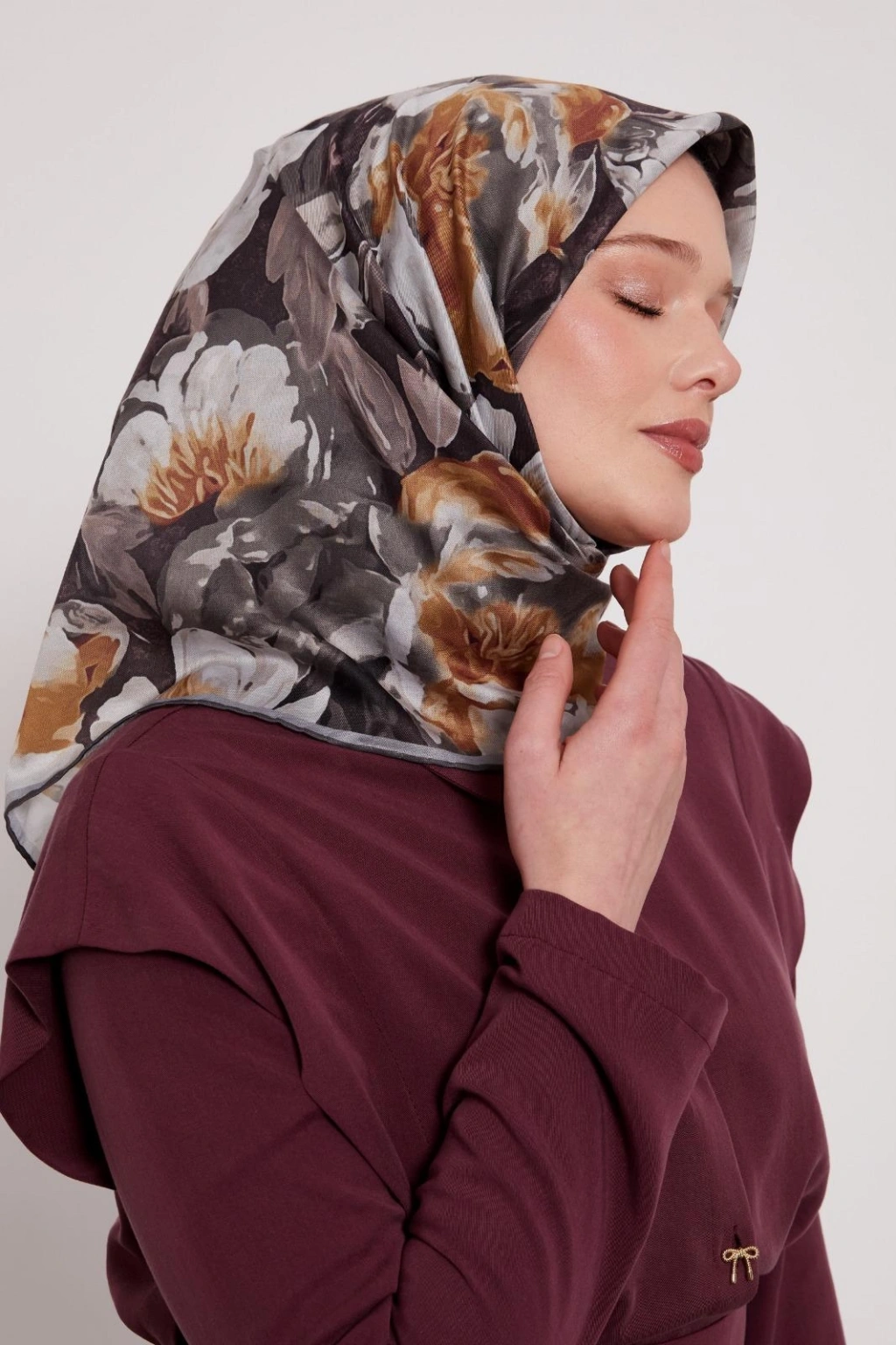 Bu eşarp, özel tasarımıyla her kıyafete kolayca uyum sağlar. Zarif lotus deseniyle dikkat çeker.