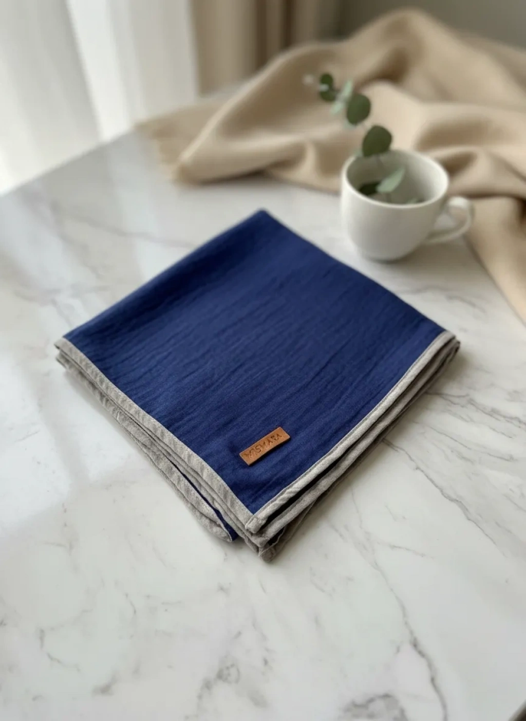 Mismara Müslin Biyeli Eşarp, şıklık ve zarafeti bir arada sunar. İndigo mavi ve vizon renk kombinasyonuyla dikkat çeker.