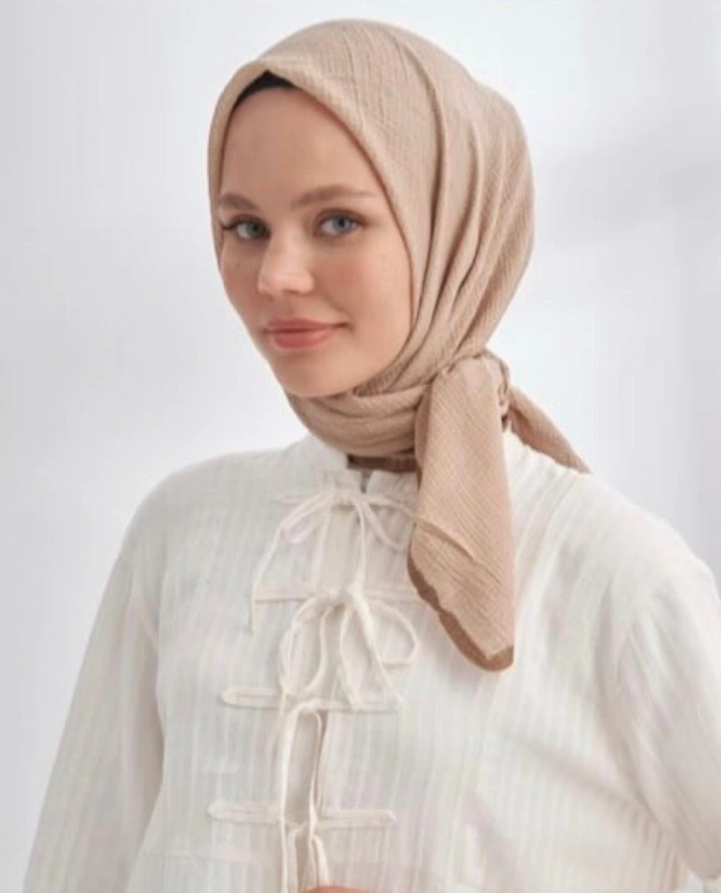 Mismara Müslin Biyeli Eşarp Pudra Vizon, şıklık ve zarafeti bir arada sunar.