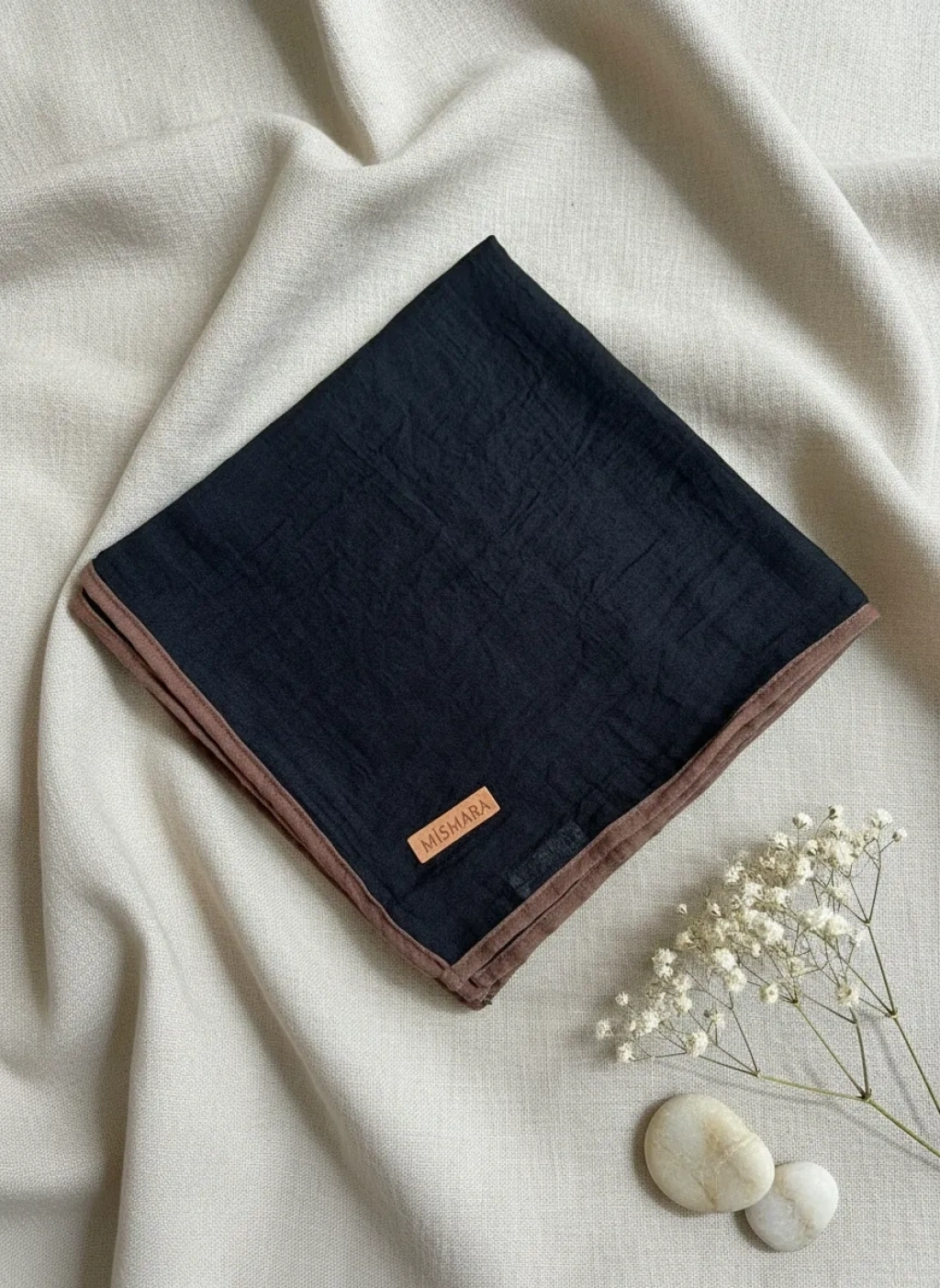 Mismara Müslin Biyeli Eşarp Siyah Kahve, şıklığı ve rahatlığı bir arada sunar.